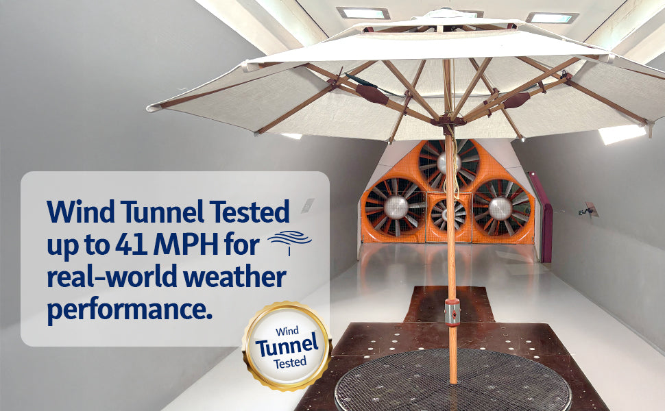 The umbrella has been windtunnel tested up to 43 MPH.