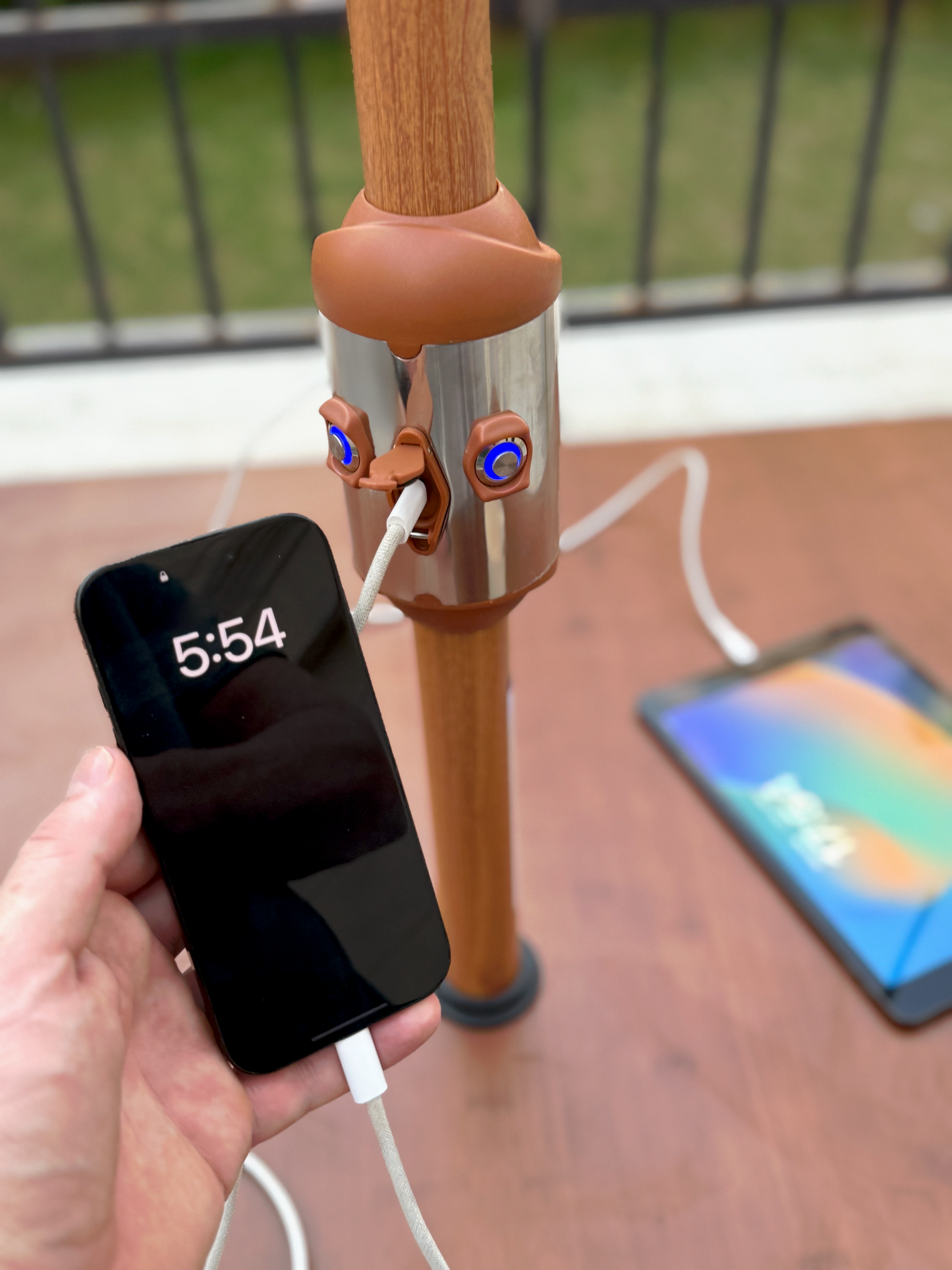 Yes, it includes USB-A and USB-C fast-charging ports to keep your devices powered while you relax.